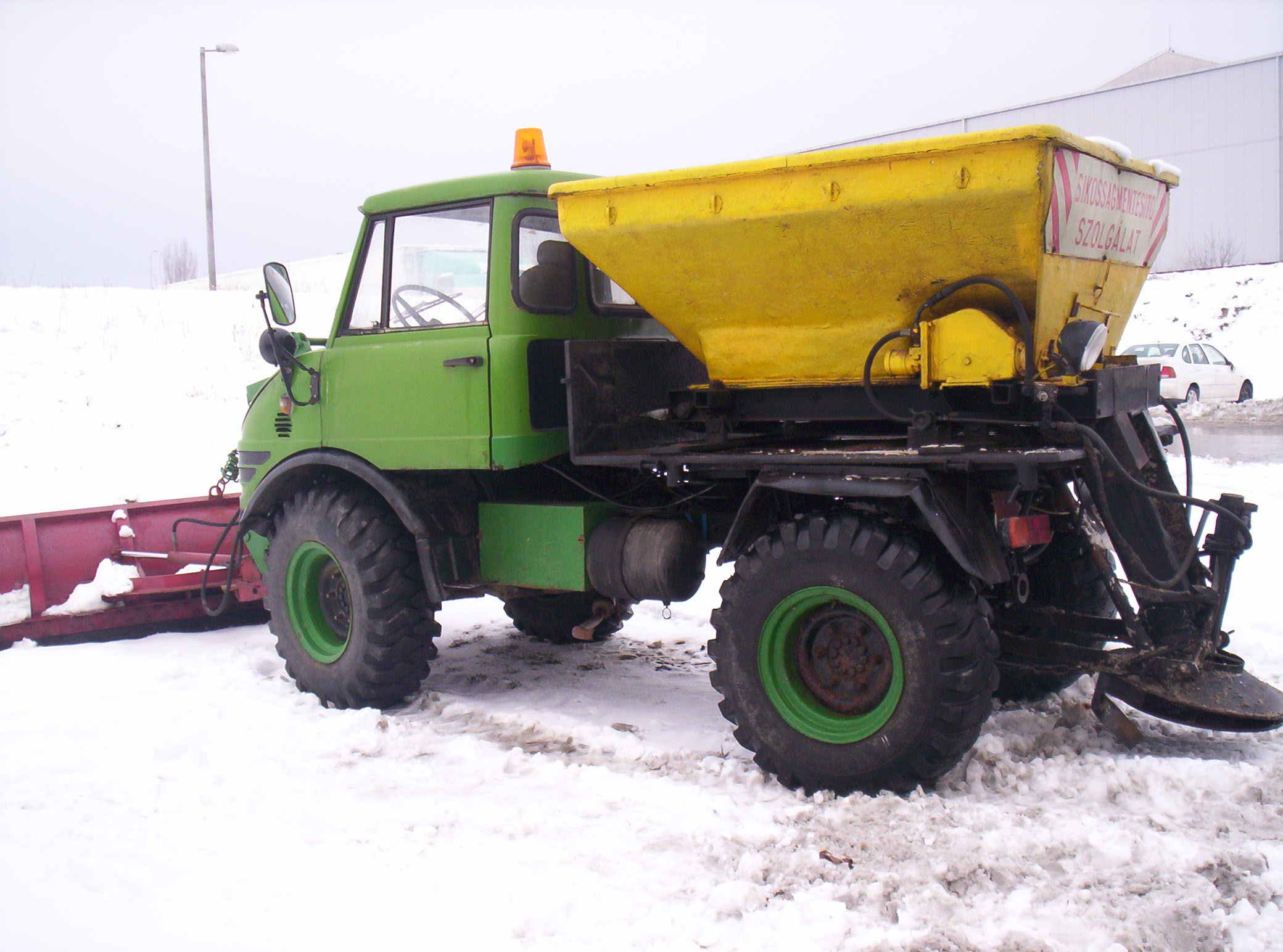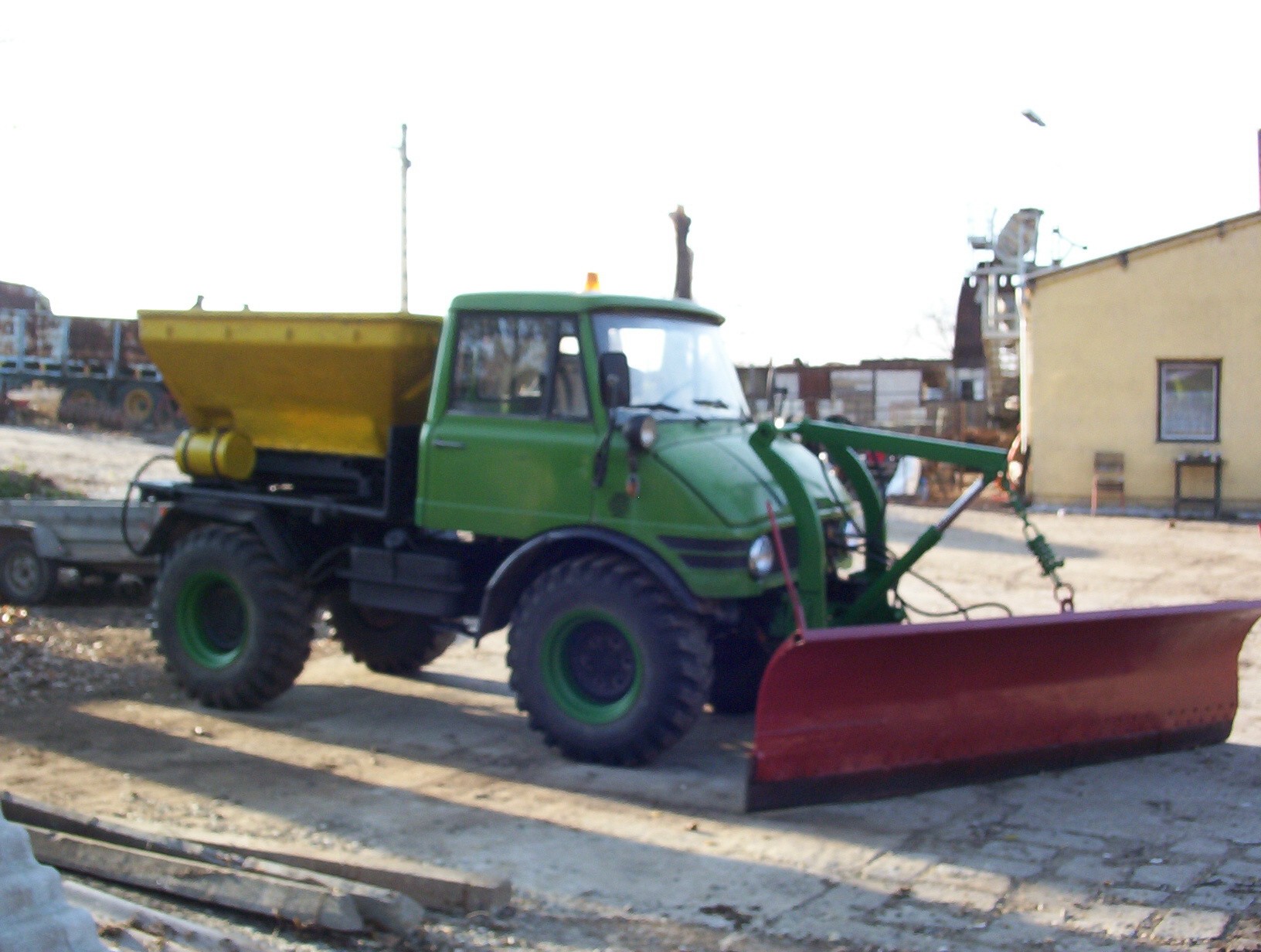 Unimog 421 homlokrakodó kanállal, három oldalra billenthető platóval, műtrágyaszóróval, hótolólappal és sószóró adapterrel |